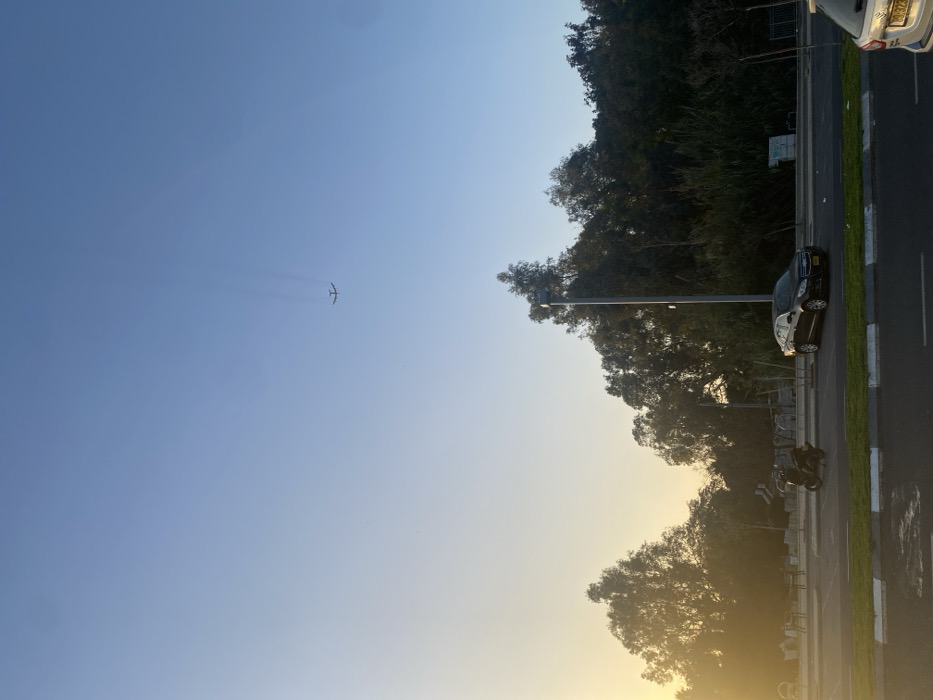 The image displays an outdoor scene in the city of Tel-Aviv, Israel, under a clear sky. The lighting indicates either early morning or late afternoon, with a warm, golden glow emanating from the lower left portion of the frame, contrasting with the light blue sky overhead and to the right. In the upper right quadrant of the sky, a twin-engine aircraft, consistent with a commercial airliner, is observed in flight. It is oriented with its nose pointing towards the lower left, leaving a faint double contrail trailing behind it towards the upper right. The foreground consists of a dark asphalt surface, likely a road or parking lot, with white painted demarcation lines. On the right side of this surface, a dark-colored sedan, identifiable by a Chevrolet emblem on its grille, is parked, facing left. To the left of the sedan, a dark-colored scooter or moped is also parked, facing left. A light-colored vehicle's rear bumper is partially visible on the far right edge, displaying a yellow-background license plate consistent with Israeli registration. Behind the paved area, a dense line of trees with green foliage forms the primary background. The trees on the left are bathed in the golden light, while those on the right are darker and appear in shadow. A tall, grey street light pole stands vertically in the mid-right section of the image. In the left-midground, behind the parked scooter and illuminated trees, several large, light-colored, possibly concrete or stone blocks are visible. No people are present in the scene.
