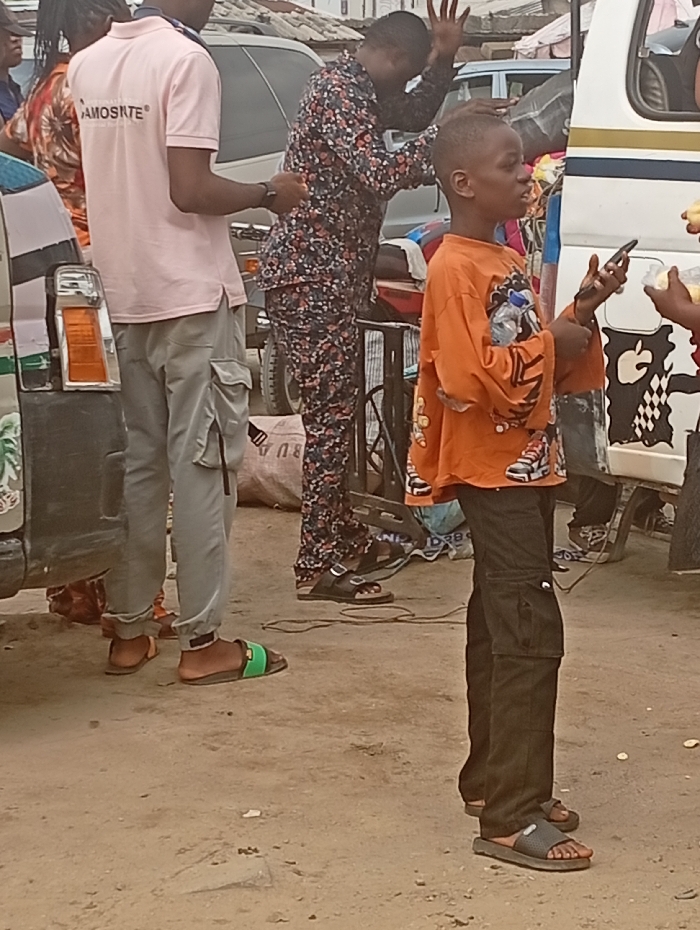 The image captures an outdoor scene in Igwuruta, Nigeria, featuring multiple individuals and vehicles on dusty ground. In the foreground, a young male, appearing to be a child or pre-teen, stands facing left. He wears an oversized orange long-sleeved shirt with graphic designs, dark cargo pants, and dark slides. He holds a black smartphone in his left hand and extends his right hand to receive light-colored food items in clear plastic containers from an unseen person to his right. To the young male's left, a man stands, partially obscured by a light-colored vehicle on the far left. This man wears a light pink polo shirt with "AMOSITE" printed on the chest, light grey cargo pants, and green and black slides. His right hand is extended forward. Behind him and slightly to the right, another man, dressed in a dark, multi-patterned long-sleeved shirt and matching pants, stands with his head bowed and both hands raised above his head, palms open. Vehicles include a partially visible white van or bus on the right with a black and white checkered pattern and a visible "Apple" logo-like sticker. Blurred individuals, background structures, and dark electrical wires on the ground near the feet of the man in patterned attire are also present, suggesting a public or market environment.