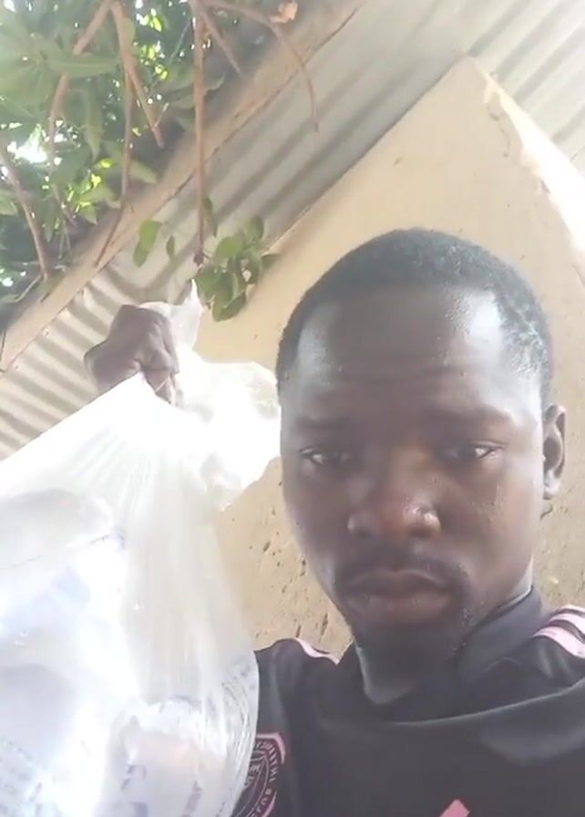 A man is holding a plastic bag of ice in his right hand. He is wearing a black Adidas shirt with pink stripes. He appears sweaty. The background shows a tree, a corrugated metal roof, and a concrete wall.