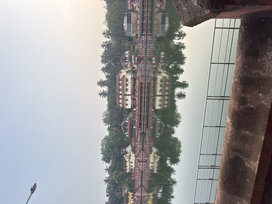 This image displays the Koti Teertha sacred pond in Gokarna, India, viewed across the water toward the eastern bank under a light, hazy sky. In the immediate foreground, a weathered reddish-brown concrete barrier or ledge occupies the bottom segment, supporting a silver-colored metal railing composed of three horizontal bars that spans horizontally across the frame. A portion of a matching reddish-brown concrete post is visible at the far right. The midground features a calm body of greenish-grey water, clearly reflecting the buildings, vegetation, and sky from the opposing bank. On the far bank, a series of structures line the water's edge. Immediately bordering the water is a low-rise platform or retaining wall characterized by numerous vertical pillars painted with alternating red and white stripes. Behind this, several smaller buildings with dark, possibly tiled, roofs are visible. Further inland, a cluster of multi-story buildings includes a prominent cream-colored, three-story structure with a red tiled roof and numerous windows. Adjacent and further along the bank are other buildings of varying colors, including yellow, light-colored, and blue, some with indiscernible signage. Dense tropical vegetation, primarily palm trees, forms a lush green backdrop behind and between these structures. The sky, occupying the upper third of the image, is a light, hazy blue-white. A dark grey street light fixture mounted on a pole extends into the upper-left portion of the sky. No individuals, specific actions, or interactions are discernible.