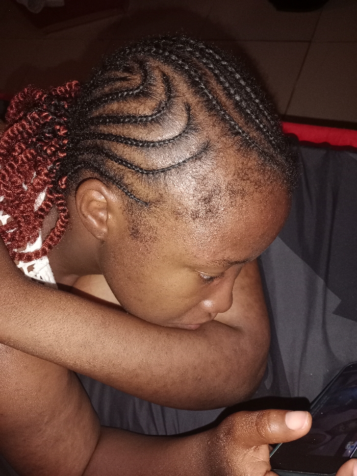 This image, taken in Rafin Par, Nigeria, features a close-up, medium shot of an individual of African descent. The person's head is tilted downwards and to the right, their gaze directed at a dark-colored smartphone held in their right hand. Their natural hair is styled into distinct cornrows with curved patterns across the scalp. On the left side of the head, reddish-brown, kinky-textured hair extensions are visible, gathered, and include a white, possibly crocheted, decorative element. The individual is wearing a white garment with a textured or crocheted pattern visible on the upper torso. The right arm is bent, resting on a dark fabric surface. The background is dark, out of focus, and indistinct, indicating an indoor setting with low ambient light, featuring dark fabric and a subtle red element in the upper right.