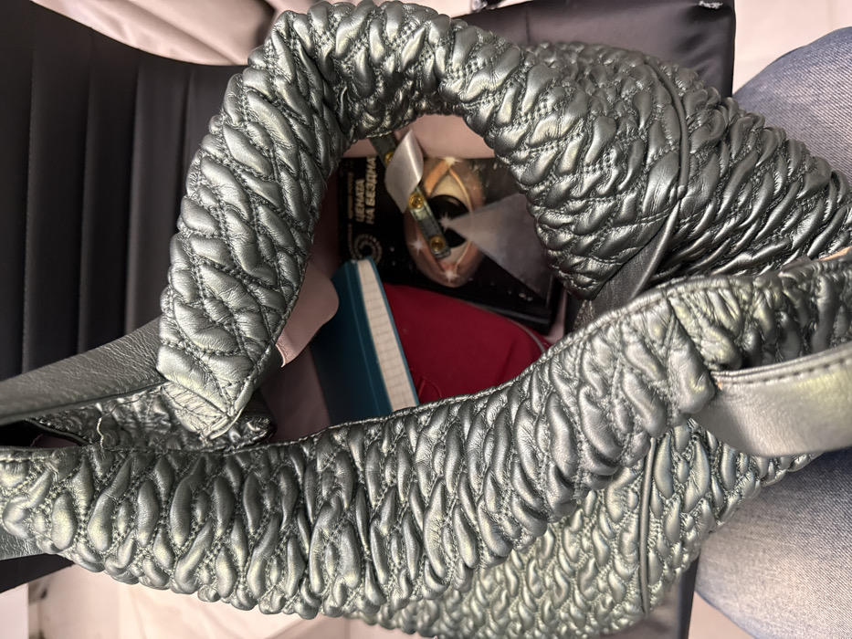 - "An open, metallic grey-green handbag, characterized by a deeply quilted, wavy texture, is depicted resting on the lap of an individual wearing light blue jeans" by FM-iCfSu2, licensed under CC BY 4.0