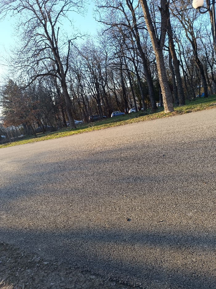 The image presents an outdoor scene in Veliko Tarnovo, Bulgaria, captured during late autumn or winter. A dark grey asphalt road, textured with small aggregate, occupies the lower two-thirds of the frame, slanting diagonally upward from left to right. Above the road, a narrow strip of green grass defines a gentle incline. Beyond this incline, a dense forest of deciduous trees with bare, dark branches extends across the midground and background. Approximately 6-8 passenger vehicles, including a light blue sedan and a white car, are parked along the grassy slope beneath the trees. The sky above the trees is clear and light blue. Sunlight illuminates the scene from the left, casting distinct shadows across the road surface and highlighting the tree trunks. A white, spherical lamp fixture is partially visible on the far right edge, extending into the upper quadrant. No individuals are present in the scene.