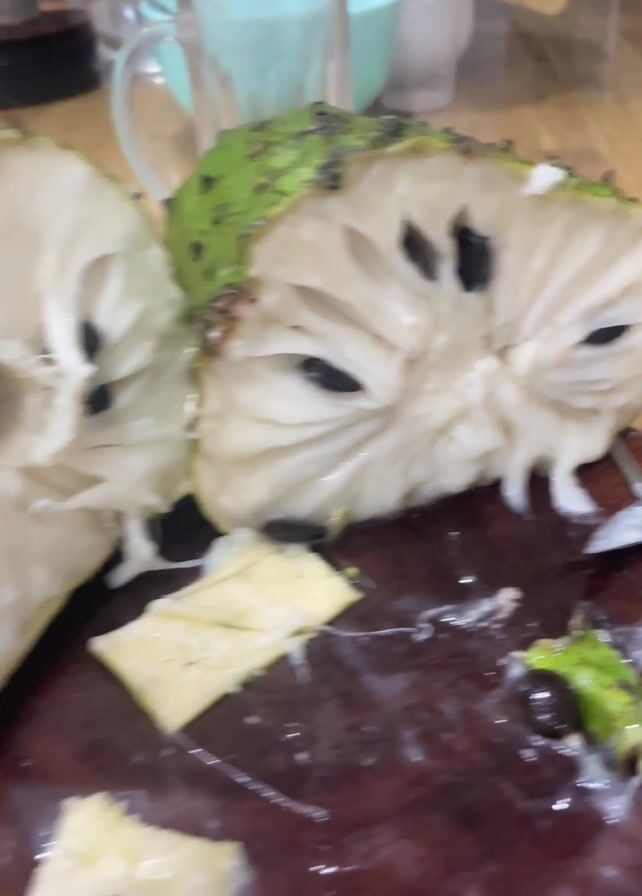 cut soursop fruit on a wooden cutting board. The fruit is green on the outside and white on the inside, with black seeds visible. A hand picks up one half of the fruit to show the inside, before putting it back down on the board. There are a few pieces of cut soursop on the board. In the background, there are mugs and a potted plant. The lighting is bright and the scene is indoors.