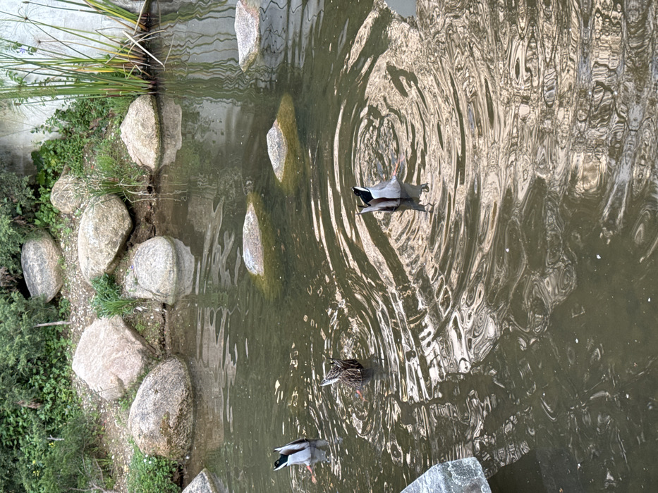 The image depicts a pond within the Calouste Gulbenkian Foundation gardens in Lisbon, Portugal. Three mallard ducks (Anas platyrhynchos) are visible in the murky greenish-brown water, each in a "dabbling" posture with their heads submerged and only their hindquarters, tails, and orange webbed feet visible above the surface. Two ducks, one on the far left and one on the right, show parts of a green head and white neck ring, indicating they are male mallards. The central duck exhibits mottled brown plumage on its visible posterior, consistent with a female mallard. Each duck's movement creates distinct concentric ripples on the water's surface. Several smooth, lighter-colored rocks are partially submerged in the water, while a larger, gray rock is partially visible at the bottom left edge of the pond. The background consists of an earthen bank adorned with numerous large, smooth, light-colored boulders and dense green vegetation, including small bushes and tall reeds. A light-colored wall is partially visible behind the reeds in the upper right portion of the frame.
