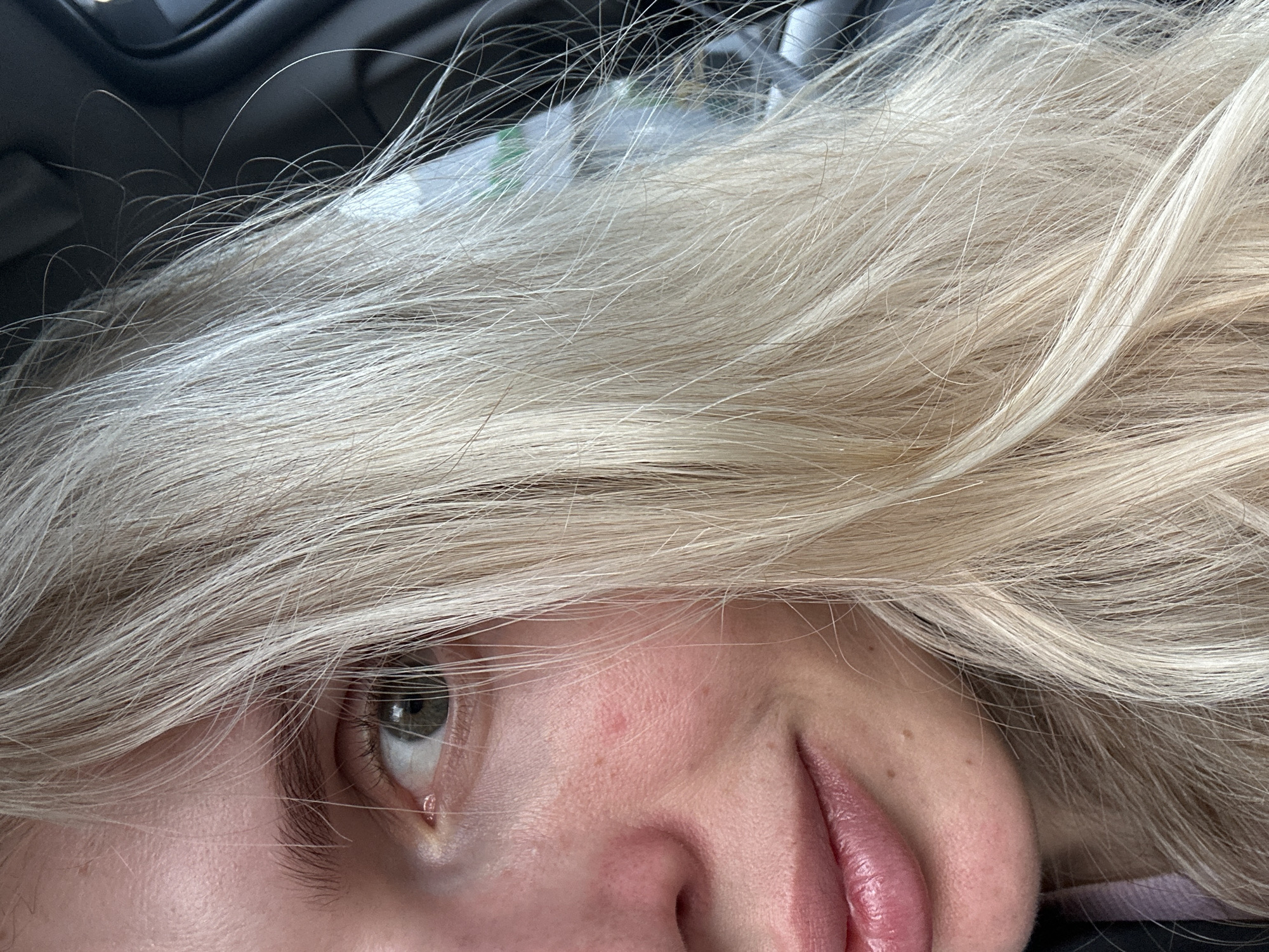 A close-up portrait depicts the left side of an adult female's face. The subject has fair skin, light blonde hair that covers part of the face and extends across the right side of the frame, and a visible green or hazel left eye. The left eyebrow is light brown/blonde. The left cheek exhibits a faint pinkish tone and a small, reddish blemish. The left corner of the mouth is upturned in a subtle smile, revealing full pink lips. Small moles are present on the skin below the left corner of the mouth. The subject's clothing includes a dark outer layer over a lighter, possibly pink, garment, visible at the lower left. The background is out of focus, appearing dark with blurred lighter and greenish elements, consistent with the interior of a vehicle, specifically indicating a car door frame and window on the right side. The image provides no discernible information to establish a specific location within Kamianske, Ukraine.