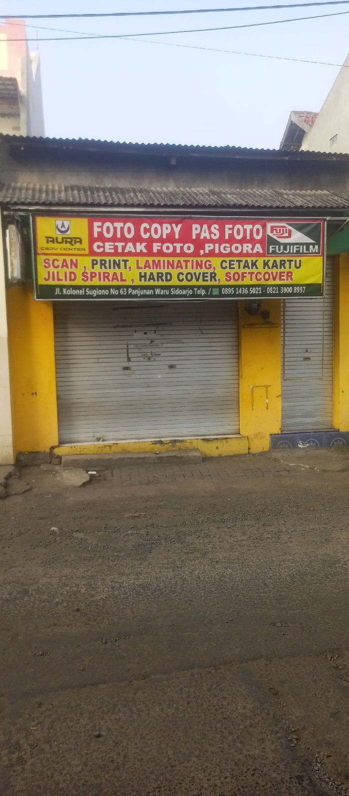 storefront in Kecamatan Waru, Indonesia, located at latitude: -7.35, longitude: 112.764. The storefront has a large red and white sign that reads "FOTO COPY PAS FOTO, CETAK FOTO, PIGORA, FUJIFILM, SCAN, PRINT, LAMINATING, CETAK KARTU, JILID SPIRAL, HARD COVER, SOFTCOVER". The sign also includes the address "Jl. Kolonel Sugiono No 63 Panjunan Waru Sidoarjo Telp./ 0895 1436 5021 - 0821 3900 8997". Below the sign is a grey metal roller shutter, closed. The shutter is partially obscured by a yellow pillar on the left. The storefront is located on a paved street, with a curb and a sidewalk in front of it. The pavement is uneven, with some cracks and patches. There are no people or vehicles in the image. The sky is overcast and there is a power line running across the top of the image.