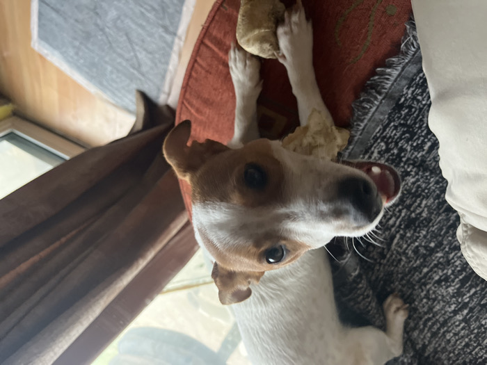 The image presents an indoor domestic scene, reportedly located in the city of Varna, Bulgaria. A small dog, predominantly white with tan and brown markings on its head and ears, is positioned with its body partially visible on the left side of the frame, resting on an orange-brown upholstered surface. Its head is turned upwards and towards the viewer, with its dark eyes focused forward. Its mouth is slightly open, revealing a portion of its tongue as it licks its lips. The dog securely holds a light-colored, irregularly shaped bone-like chew toy or treat between its front paws and within its mouth. To the right of the dog, a brown curtain partially covers a window, through which diffused natural light illuminates a blurred view of an outdoor scene featuring light and greenery. Beneath the upholstered surface and extending into the lower-left, a dark patterned rug with a fringed edge is visible. A light-colored, indistinct object occupies the immediate left foreground. No human subjects are visible.