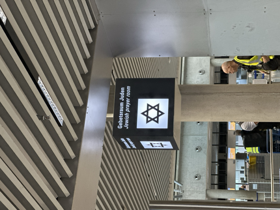 This image captures an interior view of a modern terminal at Frankfurt Airport (FRA) in Frankfurt, Germany. A prominent black, illuminated cubic sign is centrally positioned, mounted to a light grey concrete column. The sign displays "Gebetsraum Juden" and "Jewish prayer room" in white text, accompanied by a white Star of David symbol on a black square background, visible on two sides. Above, the ceiling features a contemporary design of parallel light grey and white slats, with a linear LED light fixture and a fire sprinkler head mounted. In the lower right foreground, a bald adult male wearing a dark shirt and a yellow high-visibility vest is partially visible, facing right and appearing to walk. In the blurred background to the left, airport check-in counters (one labeled "284") are discernible, complete with digital displays and baggage handling equipment, alongside other indistinct human figures.