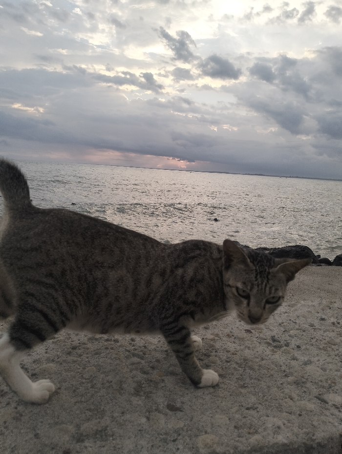 - "A gray tabby cat with white paws stands on a concrete surface near a body of water" by FM-sAcf03, licensed under CC BY 4.0
