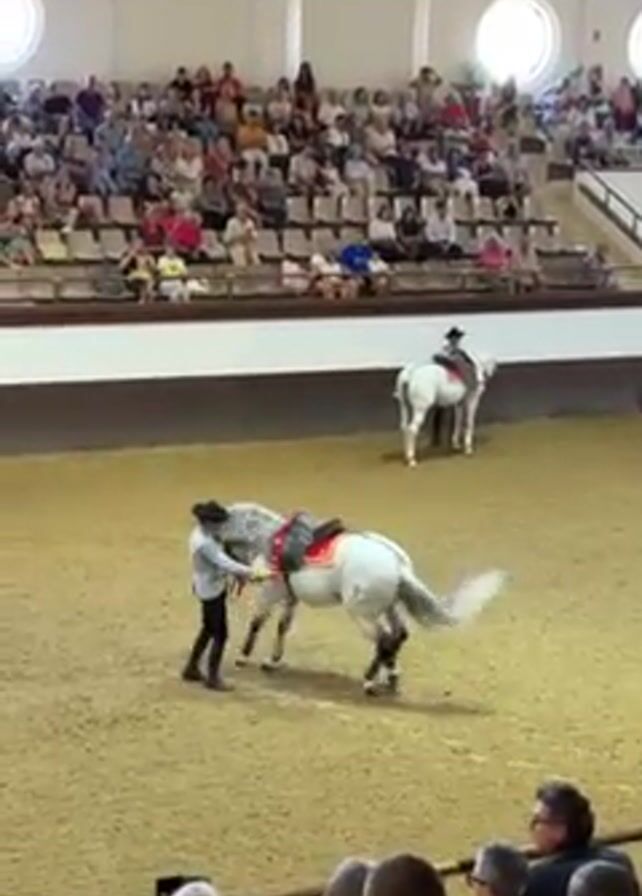 The video captures a captivating scene within an indoor equestrian arena, where a white and gray horse is the focus of attention. A man, dressed in dark pants and a light-colored shirt, stands beside the horse, holding its lead. The horse appears to be performing a gentle, dance-like movement, possibly a bow or curtsy, as the man guides it. The horse is adorned with a red and gold saddle and blanket, adding a touch of elegance to the spectacle. In the background, another horse and rider can be seen standing still, possibly waiting for their turn in the performance. Spectators fill the tiered seating around the arena, their presence indicating a performance or show. The arena itself has a sandy floor, typical for equestrian activities. The overall atmosphere is that of an organized and potentially competitive equestrian event.