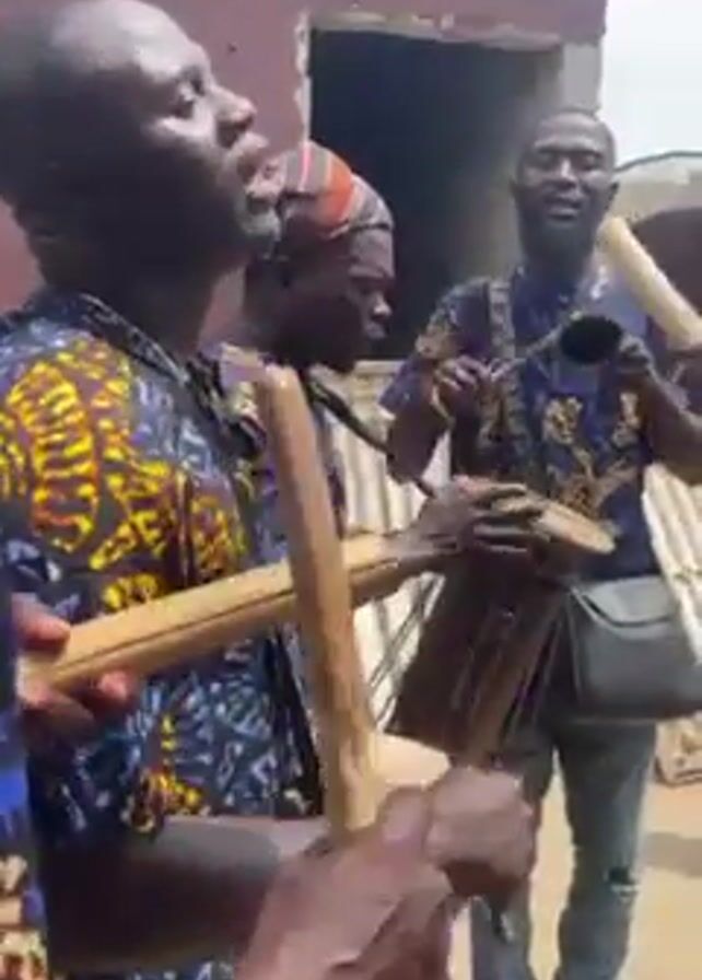 Several men are playing music outside a building. The men are wearing colorful, patterned shirts. One man holds and strikes a pair of thick bamboo sticks, while another beats a small drum with a stick. The background shows a partially ruined building and other people milling about.