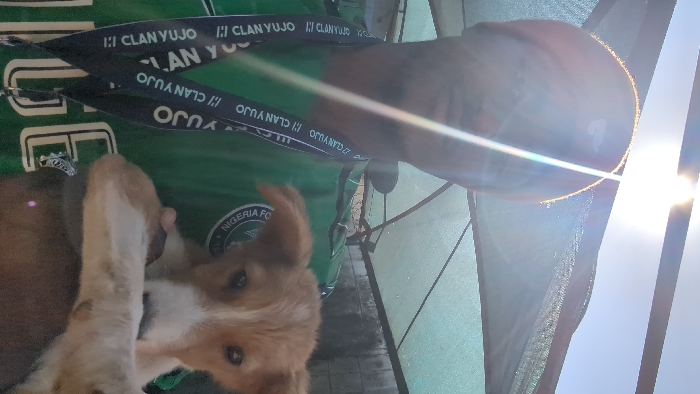 The image displays an individual holding a light brown and white dog in an outdoor setting in Narayi, Nigeria. The person, an adult male, is positioned in the foreground, facing the camera, with a prominent sun glare emanating from directly above and behind his head, creating significant lens flare and backlighting. He wears a green short-sleeved shirt, identified as a "NIGERIA FC" jersey, and two black lanyards with "CLAN YUJO" text are visible around his neck. He is cradling a dog with light brown fur, white markings on its face and chest, and prominent floppy ears; the dog's front paws are visible on the individual's arm. The background includes a light green mesh shade net under a bright blue sky, and a concrete block wall is partially visible to the right.