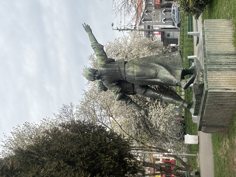 A bronze monument, "Spomenik borcima za Beograd" (Monument to the Fighters for Belgrade), depicting two figures, stands in Karađorđev park, Belgrade, Serbia