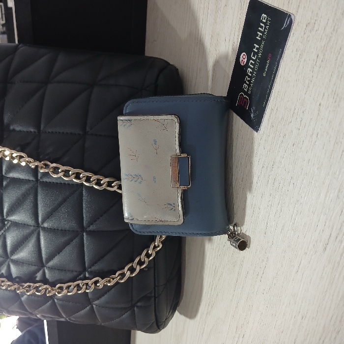 The image displays an indoor scene in Gaza, Palestinian Territory, featuring three primary items on a light-colored, wood-grain surface. In the background, a large black quilted handbag with a gold-colored chain strap is partially visible on the left. In the foreground, a small, bifold-style wallet is centrally placed. This wallet has a muted blue lower section and a light grey flap patterned with faded light blue botanical designs, secured by a gold-toned metal clasp. A metallic zipper pull is visible on the wallet's left side. To the right of the wallet, a black rectangular card is positioned, displaying a logo and the text "BRANCH HUB" in white and red, with "BRANCH OUT WORK SMART" and "Branch20" printed below. The background beyond the items is dark and out of focus.