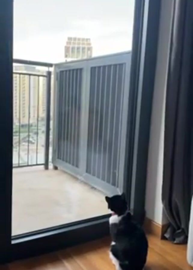 A medium shot shows a black and white cat sitting in an apartment, looking out through a large window at the balcony and the city beyond