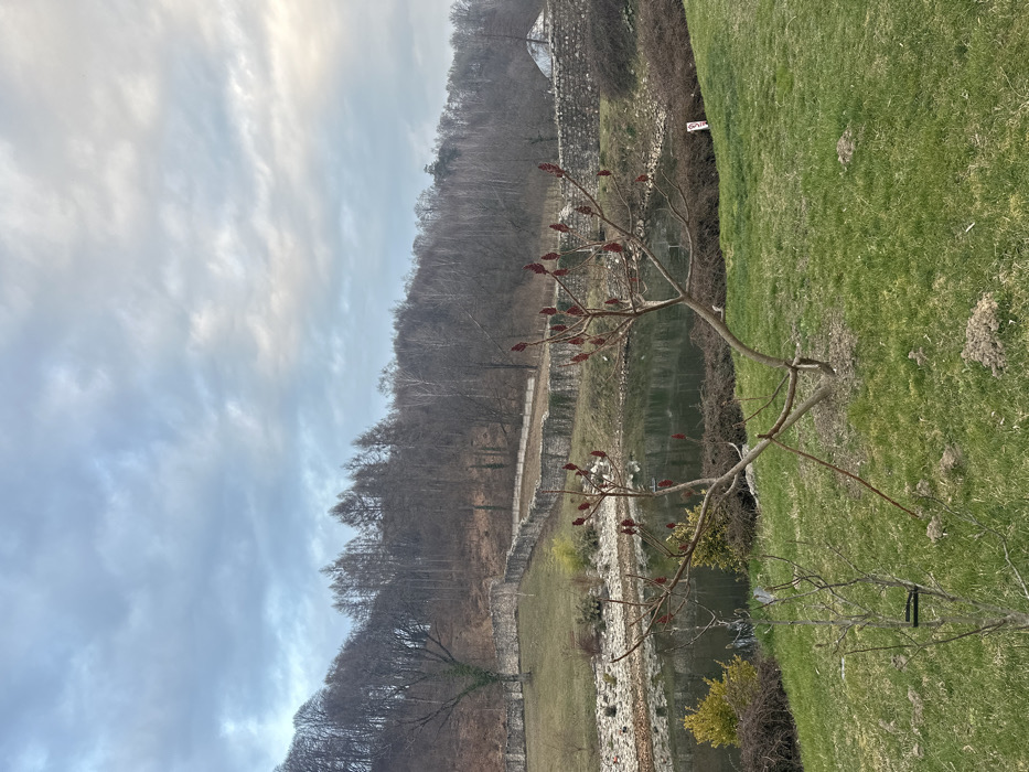 The scene depicts an outdoor landscape in Romanii de Jos, Romania, under an overcast sky. In the immediate foreground, a grassy slope exhibits two small, deciduous trees. The prominent tree on the right features multiple bare branches tipped with clusters of dark red, conical structures, possibly dormant flower heads or fruit, and is supported by a slender stake. To its left, a smaller, thinner bare tree with a black band on its trunk stands. Several small mounds of dark earth are visible on the light green grass. Beyond the foreground, a tranquil body of water reflects the cloudy sky and distant vegetation. A low, winding stone wall, constructed from light-colored, irregular stones, defines the far bank of the water. This wall extends across the midground. Beyond the wall, a grassy field leads to a densely wooded hillside dominated by bare deciduous trees, suggesting a dormant season. To the far right, partially obscured by bushes, a section of another stone wall or structure is visible, with a small white sign featuring red text positioned nearby. The background is dominated by a heavily clouded sky, showing variations in grey and light blue tones. No individuals are present in the image.