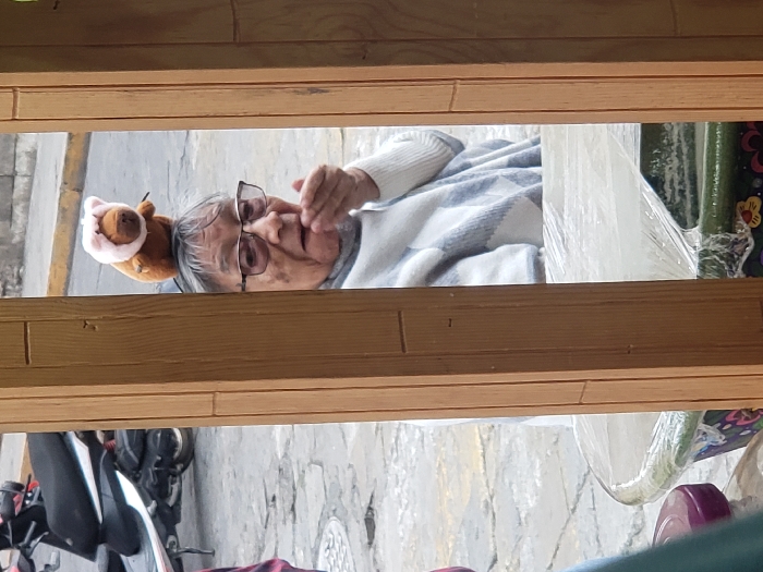 An older woman wearing glasses is lying down, with a small stuffed animal on her head. She has her hand near her mouth. The image is framed by light brown wood, possibly a window frame. A motorcycle and a street scene are visible in the lower left corner, suggesting the view is from an elevated position. Other items wrapped in plastic are visible to the right of the woman. The overall scene gives a candid and somewhat unconventional snapshot.