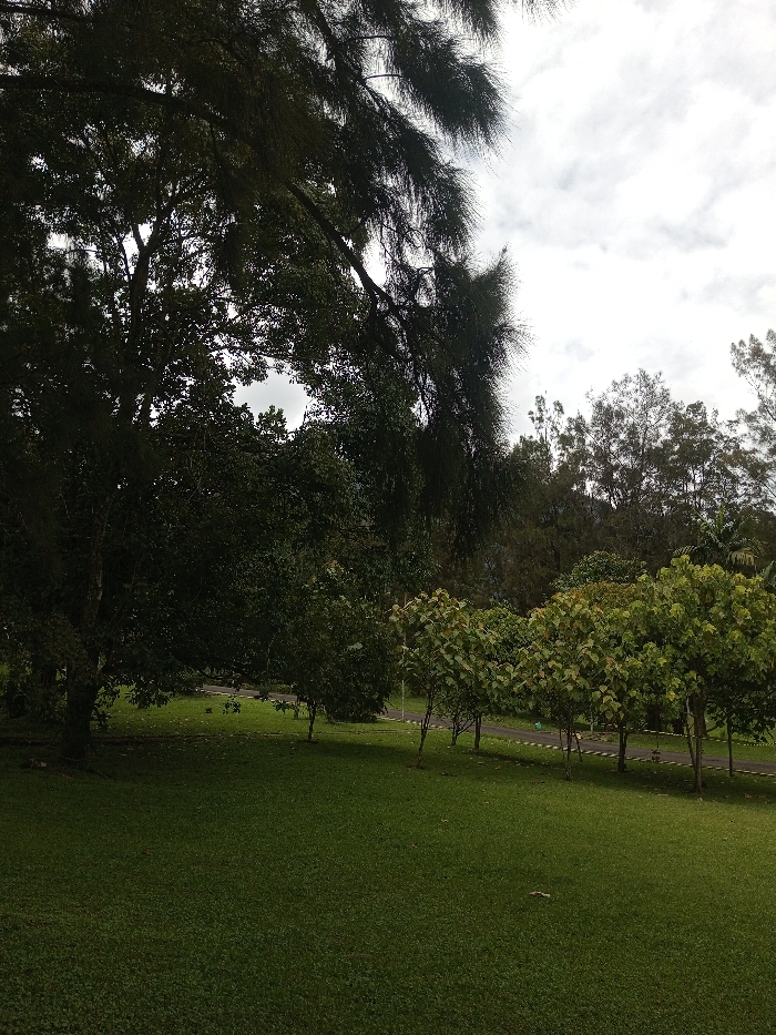 Lush green lawn dominates the foreground. Trees, some large and with drooping branches, line the perimeter. Smaller trees form a row towards the middle ground. A winding path cuts through the trees in the distance. The sky is overcast and visible through gaps in the tree canopy. Overall, the scene depicts a serene park or garden setting.