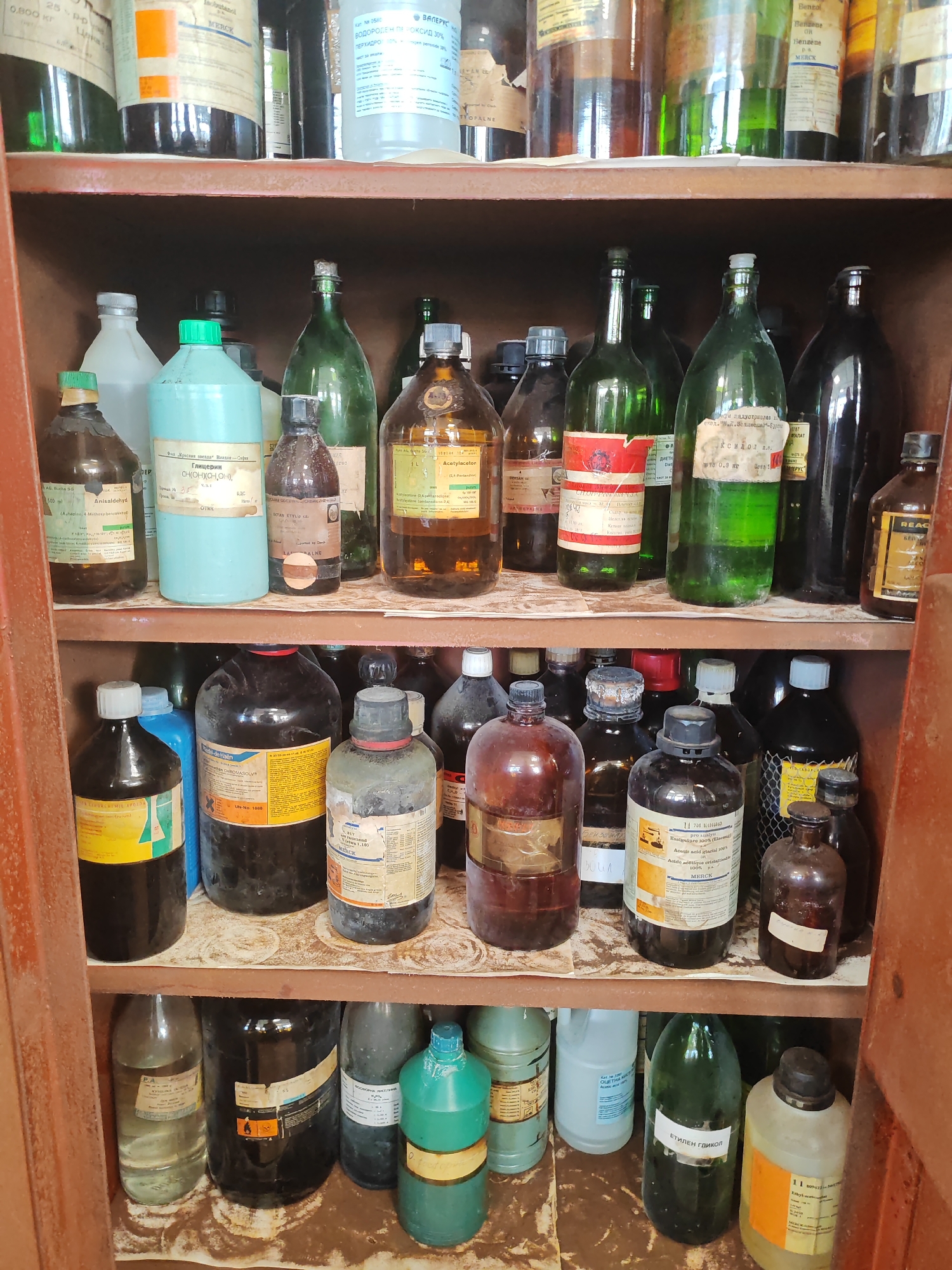 The image depicts a shelf in a cabinet filled with various bottles, mostly unlabeled or with faded labels, suggesting they contain chemicals or laboratory solutions. The bottles vary in size, shape, and color, with some containing liquids of different hues (clear, yellow, green, brown). Many of the labels are in Cyrillic script. There is a bottle labelled "Anisaldehyd", "Glycerin", and "Acetylaceton". Another bottle has a label mentioning "Кислол п.л.", and a green bottle at the bottom is marked "ЕТИЛЕН ГЛИКОЛ". Some bottles are labeled "MERCK". The shelf itself is stained and appears to have residues from spills or leaks, further indicating the age and possible disuse of the materials. Based on the Cyrillic labels, this image is likely from Sofia, Bulgaria.