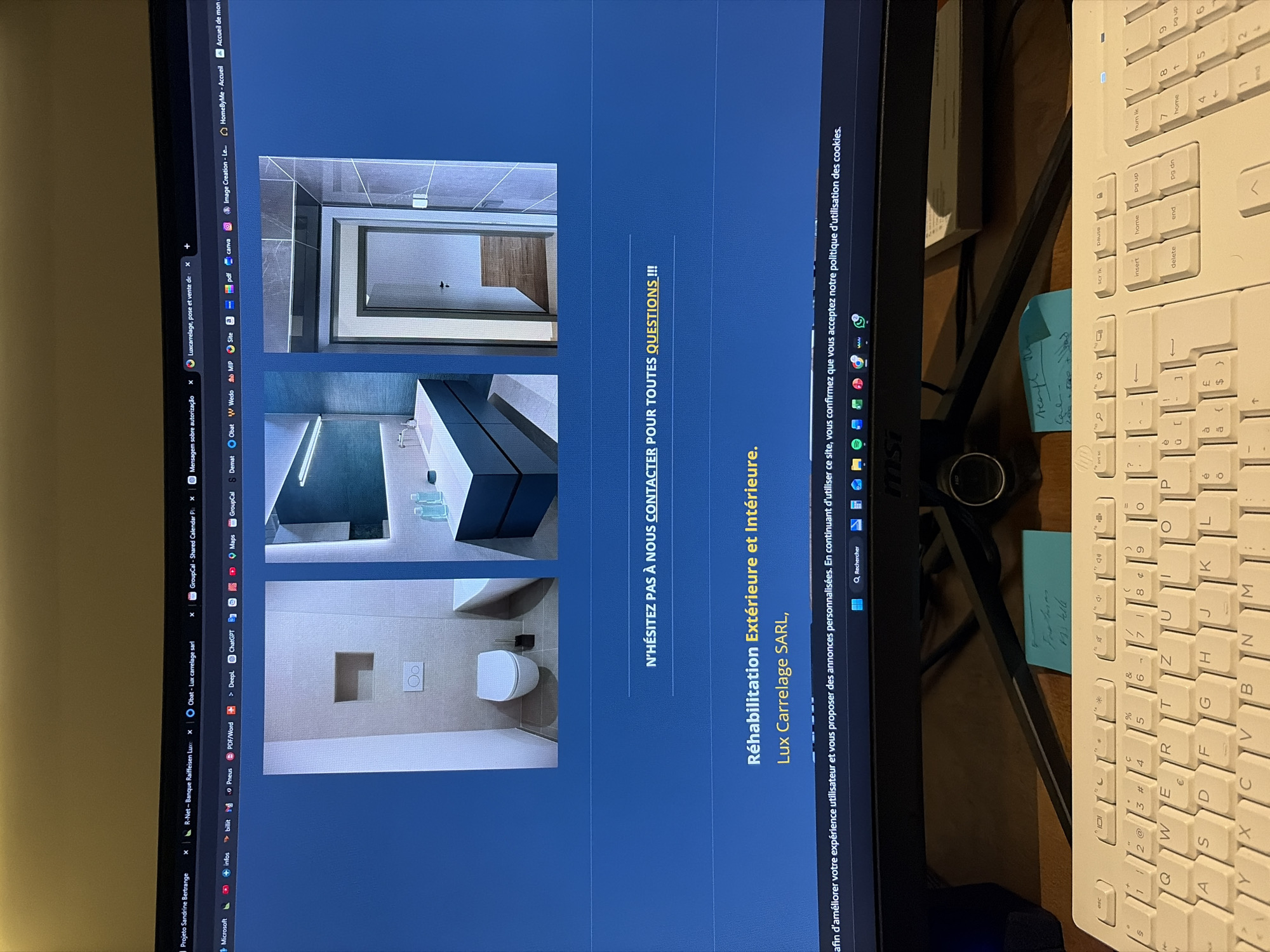computer screen displaying the website of "Lux Carrelage SARL," a tiling company, likely in Pétange, Luxembourg, given the "Bertrange" tab in the browser, which is nearby. The website features images of bathroom renovations. The screen is flanked by two white keyboards on a desk. A post-it note is attached behind the monitor.