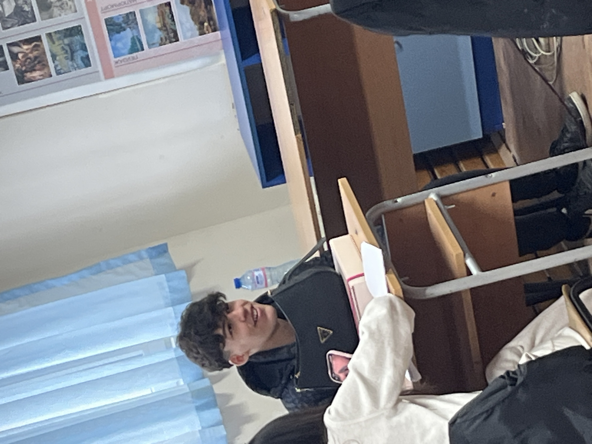 The image appears to be taken indoors, possibly in a classroom in Dimitrovgrad, Bulgaria, based on the wall decorations written in Cyrillic letters. A young male with dark hair and a black backpack is visible in the foreground, looking towards the camera. In the background, there is a blue window blind, a water bottle, and what appears to be a stack of books or notebooks. Chairs and desks are partially visible, indicating a school or educational setting. Other individuals are partially visible in the scene.