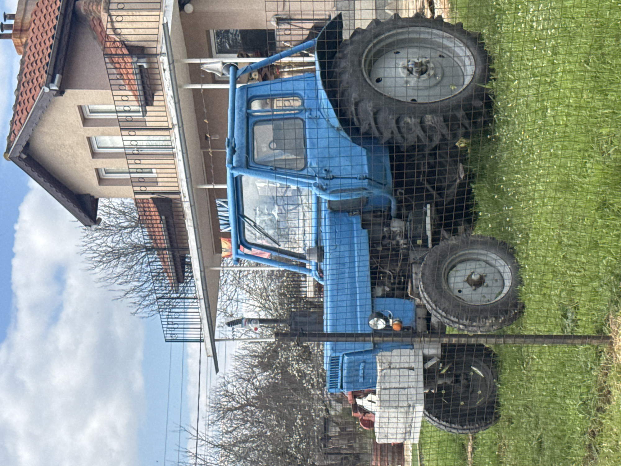 A blue tractor is parked behind a wire fence in what appears to be a yard. A multi-story building with a red tiled roof and metal railing is visible in the background. Bare trees are scattered around the scene. Green grass and sky are also visible. While the location is specified as Tutrakantsi, Bulgaria, that is impossible to verify from visual information alone. The picture does not include any people.
