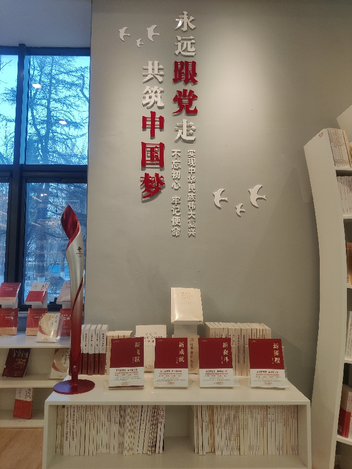 The image features a display of books and a symbolic torch. Above the display, there's a wall with Chinese characters in white and red. The text reads: "Always follow the Party" (永远眼党走), "Realize the great rejuvenation of the Chinese nation" (实现中华民族伟大复兴), "Do not forget the original intention, keep the mission in mind" (不忘初心牢记使命), and "Build the Chinese Dream together" (共筑申国梦). The titles of the books on the display table include "New Journey" (新征程), "New Struggle" (新奋斗), "New Achievement" (新成就), and "New Leap" (新飞跃), and "Xi Jinping".