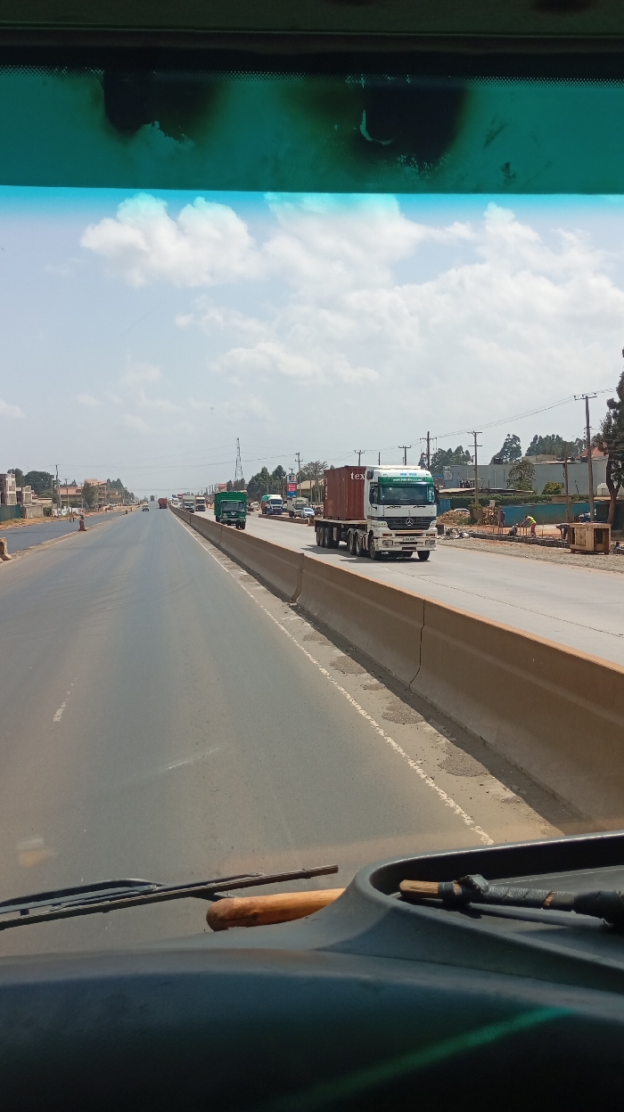The image presents a daytime scene on a multi-lane highway in Limuru Central ward, Kenya, viewed from the interior of a vehicle