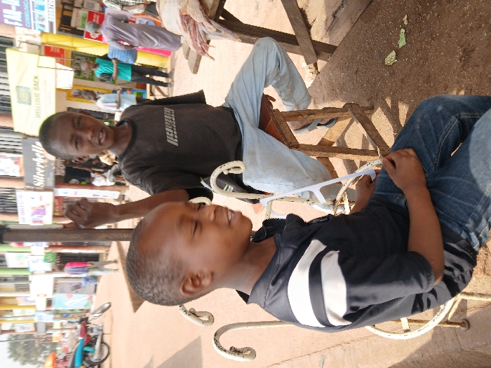 This image captures an outdoor street scene in Heany, Zimbabwe. In the immediate foreground, a young male child with dark skin is seated on a white, ornate metal chair, wearing a dark short-sleeved top with two horizontal white stripes on the upper arm and blue jeans. His head is turned slightly to the right, with his eyes partially closed and a faint smile. To his right, an older young male, also with dark skin, is seated on a plain wooden stool, wearing a dark short-sleeved t-shirt with a light-colored geometric pattern on the chest and light blue trousers. He looks directly forward, with his left arm raised and hand in a loose fist. Adjacent to the older boy, a rough wooden table displays raw meat or animal parts. The ground underfoot is reddish-brown earth with scattered green and light-colored debris. The background features a row of single or two-story commercial buildings lining a street, displaying various storefronts with visible signs such as "Silverbelle" and "WELCOME BACK." Several individuals are present in the background, including one person in a long light-colored robe and another in a red shirt. A red motorcycle is parked on the far left side of the street. The scene is illuminated by bright daylight.