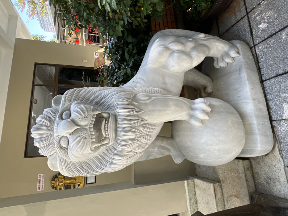 A white marble sculpture of a lion with an open mouth rests on a stone base