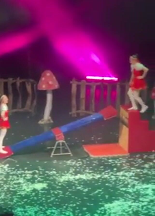 On a stage with a dark background illuminated by magenta spotlights, three performers dressed in red and white costumes are present. The stage is decorated with props like a seesaw, a small log cabin, decorative mushrooms, and a low wooden fence. Simulated snow or confetti covers the stage floor. The performers interact near a set of red stairs, exhibiting choreography or movement. The scene suggests a theatrical or dance performance taking place in a whimsical, possibly fairytale-themed setting.