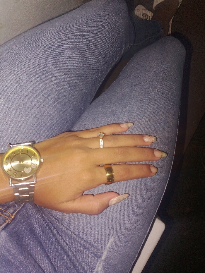 The image depicts a close-up, downward-angled view of an individual's right hand and upper legs, presumably in Los Chacos, Venezuela. The person is wearing light blue denim jeans. The right hand rests on the right thigh, adorned with a silver-toned metal link watch featuring a gold-toned face with decorative hearts on the wrist. The ring finger holds a thin gold-toned ring with a clear solitaire stone, while the middle finger wears a wider, plain gold-toned band ring. Fingernails are long and pointed, with light-colored or glittery polish showing signs of wear. A portion of a foot, clad in light-colored footwear (possibly a sneaker), is visible in the upper right. The immediate background is dark and indistinct.