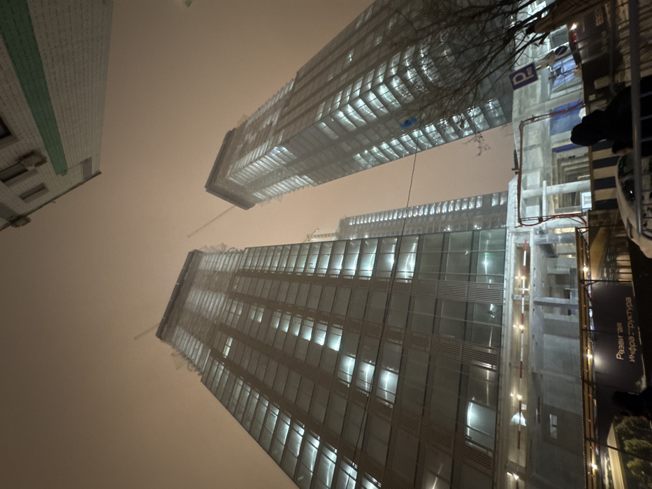 A low-angle shot captures several buildings against a foggy, overcast sky. Two high-rise structures with lighted windows dominate the view, appearing modern and possibly under construction. To the right, a partially constructed building with scaffolding and a sign is visible, along with street elements. The building on the left shows a brick facade. The overall atmosphere is urban and suggests a city shrouded in mist.