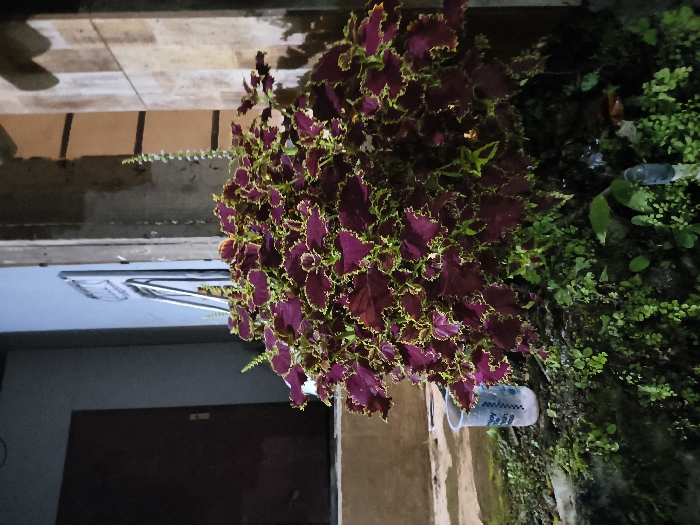 The image depicts an outdoor scene in Tarqumiyah, Palestinian Territory, under low light conditions. A large, bushy plant, characterized by dark red/purple leaves with prominent bright green/yellow edges, occupies the central mid-ground. A single, slender green stalk with small nodes extends vertically from the upper right portion of this plant. Beneath and around the main plant, dense green groundcover vegetation and moss-like growth are present. A white translucent plastic cup, bearing blue text including a partial "dy" and a repeating "Wwwwww" pattern, rests on the groundcover to the left of the central plant. A dark, vertical pipe-like object is partially visible within the groundcover in the lower right foreground. In the background, to the left, a dark brown door with a metallic handle is set into a light blue-grey wall, with steps leading up to the door. To the right, a section of a building facade or pillar, featuring light brown and beige square tiles or textured panels, is visible. Artificial illumination highlights the plant and sections of the background walls, casting shadows.