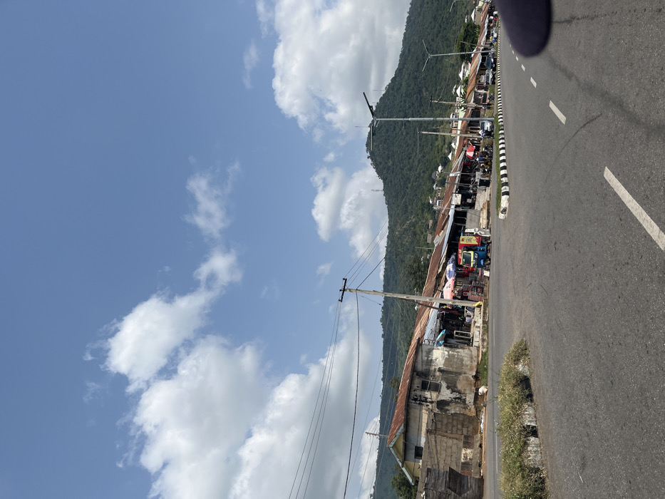 The image captures a roadside scene in Lokoja, Nigeria, with Mount Patti in the background under a blue sky with scattered white cumulus clouds
