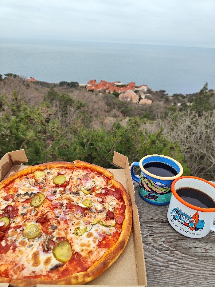 An outdoor photograph displays a partially eaten pizza and two mugs on a wooden surface in the foreground, with a coastal landscape visible in the background, specifically in Орлиновский округ, Ukraine