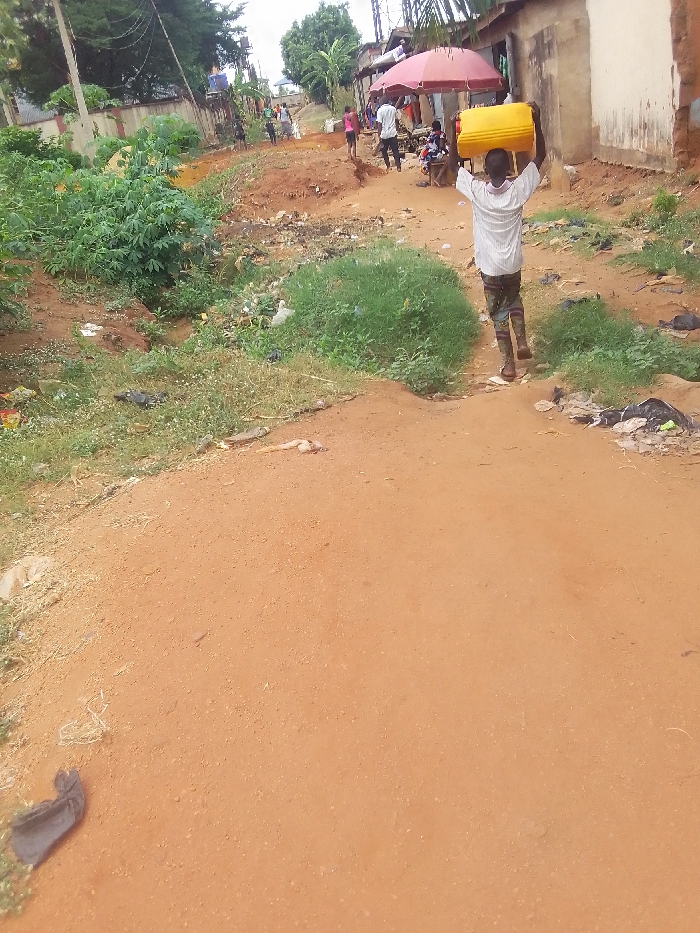 The image depicts a dirt road in Ukwu-Abwa, Nigeria, under an overcast sky