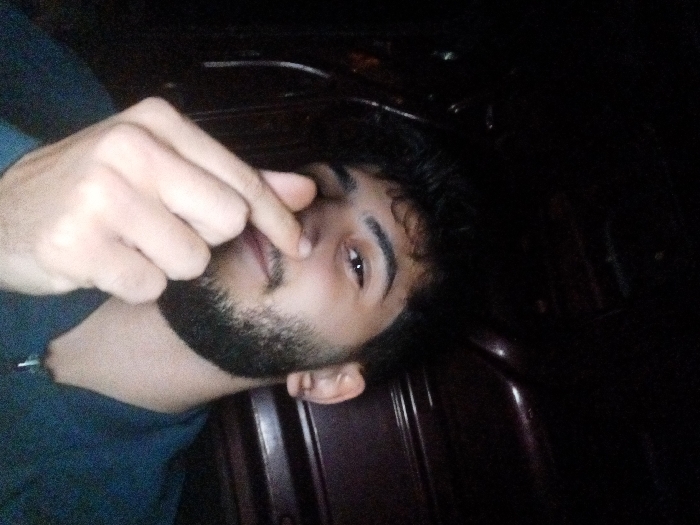 A close-up, low-light image depicts a young adult male in Dummar Municipality, Syria. The subject has dark hair, a dark beard, and brown eyes, with a faint smile present on his face. He is wearing a dark, collared garment, possibly a jacket or shirt, with a silver-colored zipper pull visible at the center of his chest. His right hand is raised towards his face, with the index finger and thumb touching to form a small heart-like shape. The tip of his right index finger is positioned just below his nose, near the philtrum. The background is predominantly dark and out of focus, suggesting an indoor environment, with hints of dark, possibly wooden, paneling or furniture visible behind and to the right of the subject's head. The lighting is dim, illuminating the subject's face and hand primarily from the front.