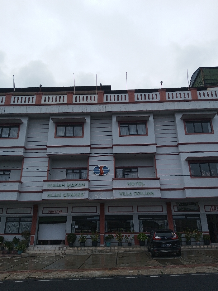 A multi-story hotel or inn stands prominently. Its facade is gray with red trim, punctuated by evenly spaced windows. Signage reads "Rumah Makan Alam Cipanas" and "Hotel Villa Senjaya," indicating both a restaurant and accommodation. A dark-colored car is parked in front. The sky is overcast, suggesting a cloudy day. Potted plants line the entryway, adding a touch of greenery. The building exhibits simple, rectangular architecture.