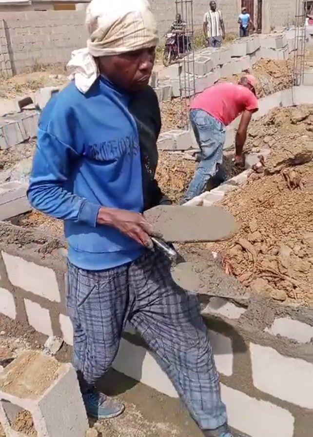 Two men are working on a construction site. One man, wearing a blue long-sleeved shirt, plaid pants, a headscarf, and sneakers, is seen carrying a brick and walking along a partially built wall. The other man, wearing a red t-shirt, jeans, and a baseball cap, is bending over and using a trowel to work on the wall. The wall is made of gray concrete blocks. The ground around the wall is dirt and loose soil. Other concrete blocks are scattered around the site. In the background, there are partially constructed support pillars, a brick wall, a water tank on a platform, and other people visible at a distance. A man is riding a motorcycle in the background as well.