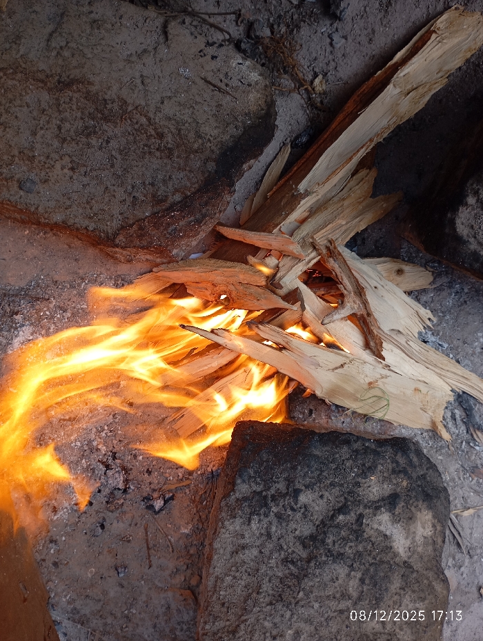 The image displays a contained ground fire in Ngong ward, Kenya, recorded at 17:13 on December 8, 2025. Yellow and orange flames actively consume a pile of dry, splintered wood fragments. The wood rests on dark soil mixed with ash, flanked by dark grey, irregularly shaped rocks that appear to form part of a fire containment area. No individuals or additional man-made objects are visible within the scene.