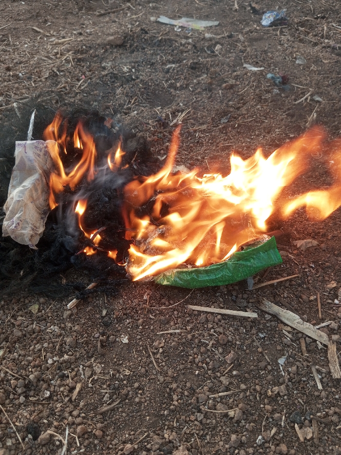 A small fire burns on dirt ground littered with pebbles and twigs. Flames engulf a green plastic bag and a white plastic wrapper, with smoke rising amidst the fire. The fire casts an orange glow on the ground. Some dark residue from the burning objects remains on the ground around the flames. Pieces of trash are scattered nearby on the ground.