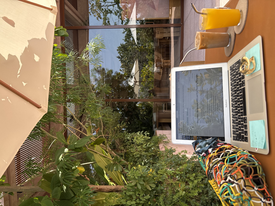 The image portrays an outdoor workspace situated under partial shade in La Cruz de Huanacaxtle, Mexico. On a light brown table, a silver MacBook Air laptop is open, its screen displaying a document titled "Discussion / Assignment: UDL and Your Teaching Philosophy." A light blue sticky note is affixed to the laptop's palm rest, and a gold-toned, abstract metallic object rests near the trackpad. To the left of the laptop, a colorful macrame-style bag, featuring green, orange, yellow, and blue interwoven patterns, is partially visible. To the right, two beverages are present: an iced coffee in a clear glass with a metal straw on a gray coaster, and a glass of orange juice, also with a metal straw, on another gray coaster. The immediate foreground is lush with dense green tropical foliage. Overhead, a portion of a beige rectangular umbrella provides shade, and a slatted pergola structure is visible. In the background, large glass panels of a modern building reflect the bright sky and surrounding tropical greenery. Through the glass, an outdoor patio area is discernible, furnished with light-colored wooden lounge seating and at least two white outdoor umbrellas.