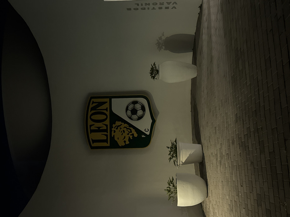 The image displays an illuminated outdoor or semi-outdoor area, identified as being in Las Crucitas, Mexico, at night or under low-light conditions. Centered on a light-colored, slightly curved wall is a prominent shield-shaped emblem for "LEON FC." The emblem features "LEON" in yellow capital letters at the top, a stylized yellow lion's head, and a black and white soccer ball, set against green and white background sections. Directly below the emblem and extending to its right, three potted plants are arranged on a dark grey paved surface. The planter on the far left is a wide, white ovular shape, followed by a standard white cylindrical pot, and then a tall, slender white vase-like planter on the right. Each planter contains green foliage. Shadows from the planters are distinctly cast onto both the wall and the paved ground, indicating an artificial light source from the left. On the far right section of the wall, the Spanish words "VESTIDOR VARONIL" (Men's Locker Room) are written vertically in dark letters. The ground is paved with rectangular dark grey pavers. No individuals are present in the scene.