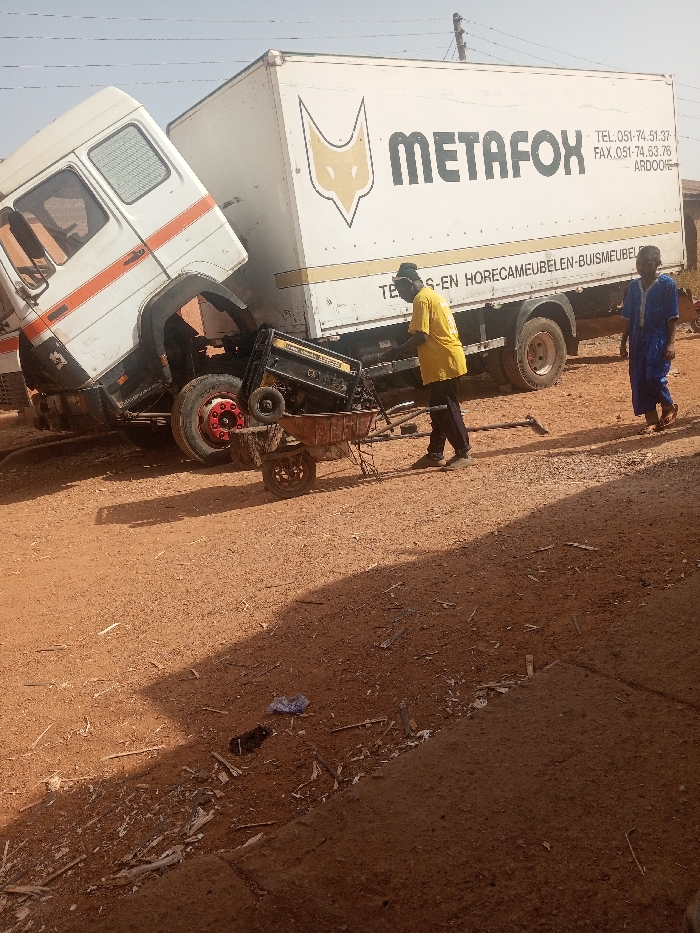 In Rigasa, Nigeria, an outdoor scene depicts a white box truck with its cab tilted forward, exposing the engine bay, indicating ongoing maintenance