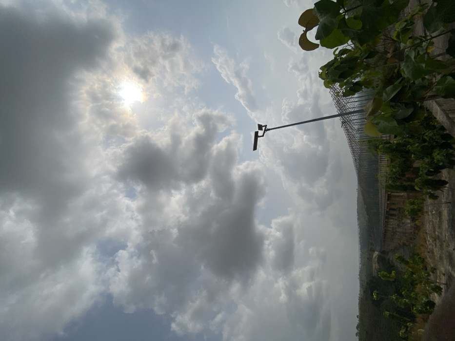 This image depicts an elevated view of the Afikpo-Owutu Bridge (also known as the Unwana Bridge) in Unwana, Nigeria, under a partially cloudy sky. The sun, partially obscured by cumulus clouds, is visible in the upper right quadrant, casting a bright glare. In the immediate foreground to the right, green foliage with broad leaves partially obstructs the view. A dark-colored, tall streetlamp with two fixtures is positioned vertically, angled slightly to the left, near the right edge of the frame. The bridge, a multi-arched concrete structure, spans horizontally across the midground, extending into the distant hazy landscape. Along the top of the bridge, a repetitive metal framework or lattice structure is visible. The terrain beneath the bridge appears dry and sparsely vegetated, indicative of a valley or riverbed. Hilly, vegetated landscapes recede into the background on both sides of the bridge. No individuals or specific actions are discernible.