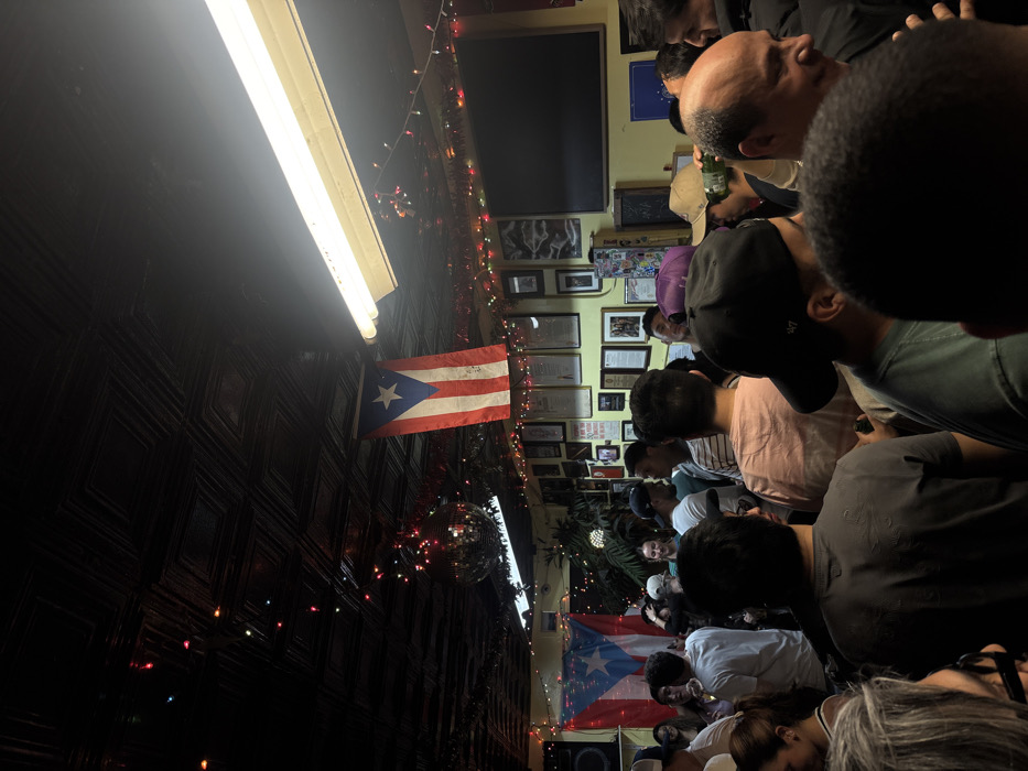 This image depicts a crowded indoor establishment, likely a bar or social club, located in New York, United States of America. The specific location within the city is not discernible from the visual information provided. The scene features a dense gathering of individuals, predominantly adults, standing in close proximity. The majority of the people are casually dressed, with several wearing baseball caps. On the right side of the foreground, a man with a bald head is smiling, holding a green bottle. Individuals are observed standing, socializing, and consuming beverages. The environment is characterized by a dark, possibly metal or pressed tin, ceiling adorned with multi-colored string lights and a suspended disco ball in the mid-left. A long, bright fluorescent light fixture is mounted on the ceiling on the right side of the frame. Two Puerto Rican flags are prominently displayed: one hanging centrally from the ceiling and another on the left wall. The light-colored walls are extensively decorated with numerous framed pictures, certificates, and various pieces of memorabilia. A large, dark rectangular screen or blackboard is mounted on the right wall. The overall lighting is dim, contributing to a festive and lively atmosphere.
