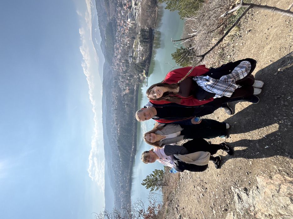 Four individuals stand on an elevated dirt path in Pancharevo, Bulgaria, positioned above Pancharevo Lake and the surrounding town, under a bright, clear blue sky with sparse clouds