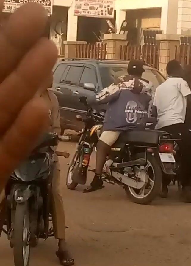 street scene with various people, vehicles, and buildings. Initially, a group of people is gathered around a motorcycle. An auto-rickshaw passes by. Later, the camera focuses on a man in a white robe walking near a building. The video then shows the hood of a blue car and later a red car parked on the street. The environment appears to be a residential or commercial area with various buildings and vehicles present.